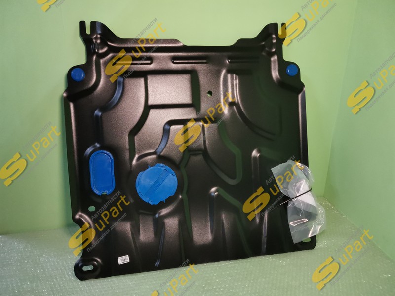 Защита картера двигателя и КПП Hyundai Solaris 2 с 2017 по н.в., Kia Rio 4 с 2017 года, Kia Rio X-LINE с 2017 года с отверстиями под слив и заглушками.