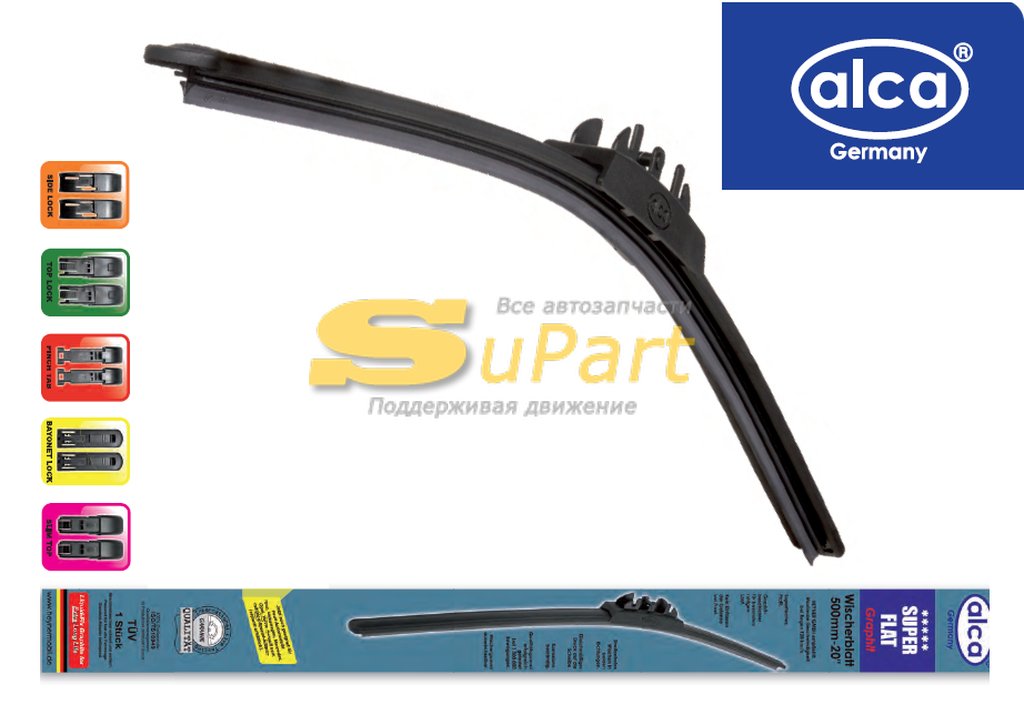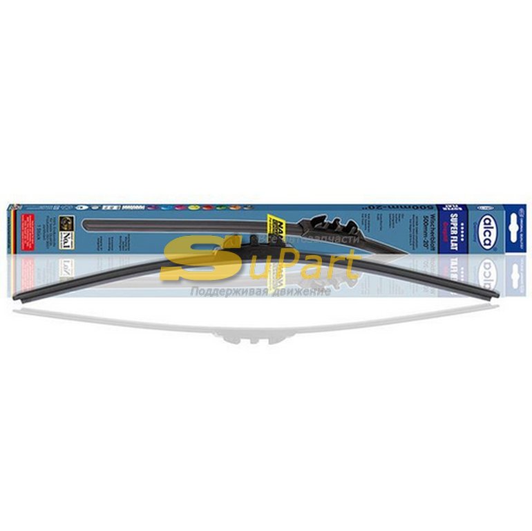 Щетка стеклоочистителя (400 мм) бескаркасная ALCA Super Flat / ALCA Для бескаркасных щеток стеклоочистителя ALCA Super Flat используется графитовое покрытие для особенно бесшумной работы. Нет замораживания и примыканий, равномерное давление на стекло. В комплекте вложено крепление крючок HOOK.